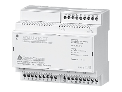 The Adamczewski AD-LU 410 GT-3PG Active Power Transducer is used for the measurement of Active Power in three-phase, three-wire balanced load AC power systems. The transducer converts the Active Power measurement into a proportional DC output signal. Due to its analogue design, fast power measurements are possible. The end-user confirms the input voltage and current range including CT/VT primary ratings at time of order along with the active power range. There are 4 standard dc signal output options available 4-20mA & 2-10V or 0-20mA & 0-10V these would then represent the active power range specified.