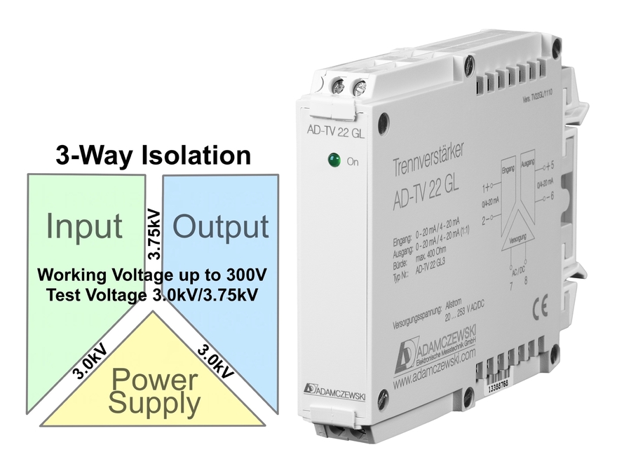 The Adamczewski AD-TV 22 GL 0/4…20mA Signal Conditioner meets the electrical safety requirements of EN61010-1 with a working voltage of 300V. The unit offers a wide range auxiliary power supply with the nominal 24 DC & 230V AC covered.