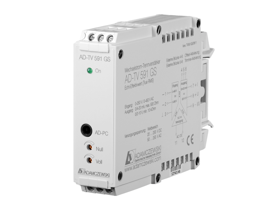 AC TRMS Voltage Transducer with selectable input 0…250V or 0…450V & selectable output range of 0…20mA or 0…10V| Model: | Adamczewski AD-TV 591 GS | |