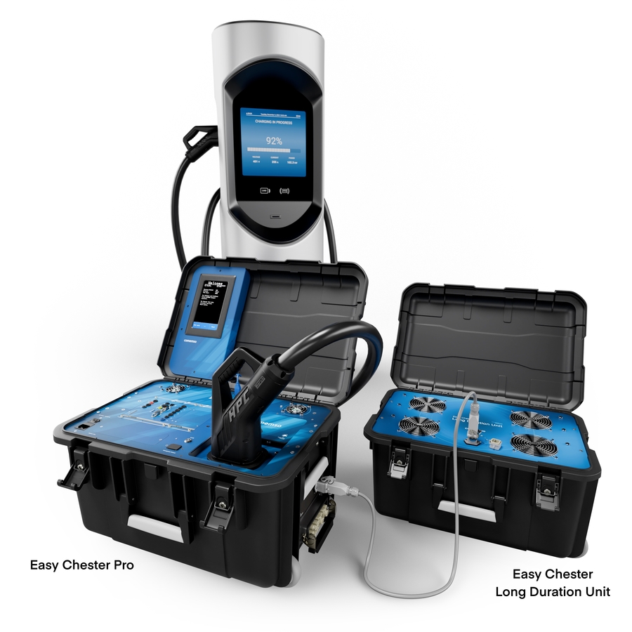 Adding the Long Duration Unit enables you to test beyond the normal 30 second test time of the Easy Chester Pro for DC chargers. It’s possible to set the test time for up to 60 minutes with a 1.8kW load. This may be useful for fault finding in the field or development testing. The Long Duration Unit for Easy Chester Pro can be powered by the 1.5kW Inverter in the field or Mains AC power if available.