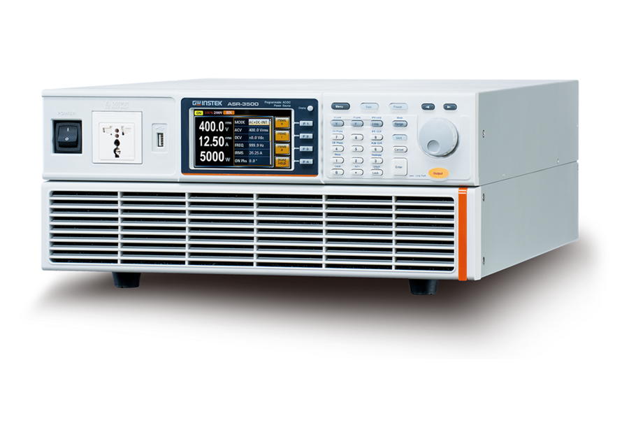 The GW Instek ASR-3500 Programmable AC/DC Power Source offer two nominal voltage ranges of 0…200Vrms/0…285DC and 0…400Vrms/570DC. The max AC Current is 50Arms at up to 100V on 200V range and 25Arms at up to 200V on 400V range. 3 key programmable output modes including, AC Power Output, DC Power Output and AC & DC Power Output, here the output can seamlessly change from AC to DC. The GW Instek ASR-3500 also provides the user with measurement capabilities including Vrms, Vavg, Vpeak, Irms, Iavg, Ipeak, IpkH, P, S, Q, PF, CF, 100th-order Voltage Harmonic and Current Harmonic. During the power output, the measurement parameters including Vrms/Irms, Vavg/Iavg and Vmax/Vmin/ Imax/Imin can be switched by users at any time to display the instantaneous calculation reading. The sequence mode provides editable 10 sets of SEQ0~SEQ9, each set has 0~999 steps, each step time setting range is 0.0001~999.9999 seconds. Users can combine multiple sets of steps to generate the required waveforms, including waveform falling, surges, sags and other abnormal power line conditions to meet the needs of the test applications. In addition, ASR-3000 Series also built in common ISO-16750-2 test waveforms in the Sequence Mode pre-set waveforms, including Momentary Drop in Supply, Reset Behaviour at Voltage Drop with 12V system, Starting Profile Waveform and Load Dump with Tr_10ms, and Td_40ms. The ASR-3000 Series software includes basic controller settings, programming the Simulate Mode, the Sequence Mode, Data Log and the arbitrary waveform editing function. Users can directly set output voltage, frequency, and start/stop phase on ASR-3000 Series through the software. The Simulate Mode can quickly simulate different transient waveforms such as power outage, voltage rise, voltage fall... etc. The arbitrary waveform editing function not only combines various waveforms, including sine waves, square waves, triangle waves, and noise waveforms, but also allows uses to draw arbitrary waveforms and output them.