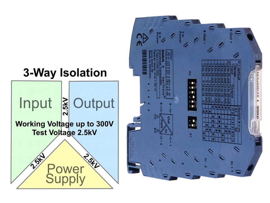 The Knick VariTrans A 21000 P0/00 Signal Conditioners key feature is that it can utilize the 24V DC DIN rail bus connection system saving lots of wiring in multi signal conditioner applications. They also offer reliably 3-way galvanic isolation between input, output and power supply with maximum long-term stability that’s backed up by a 5-year warranty.